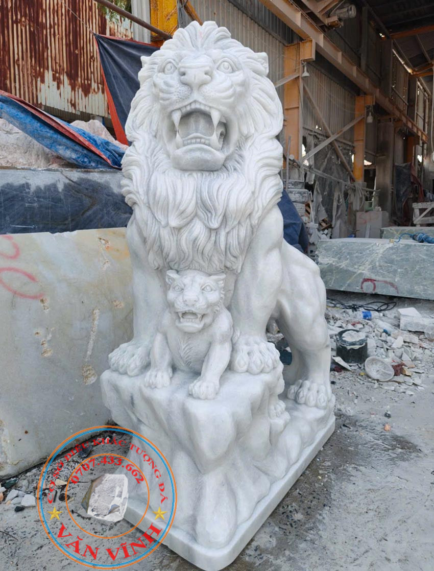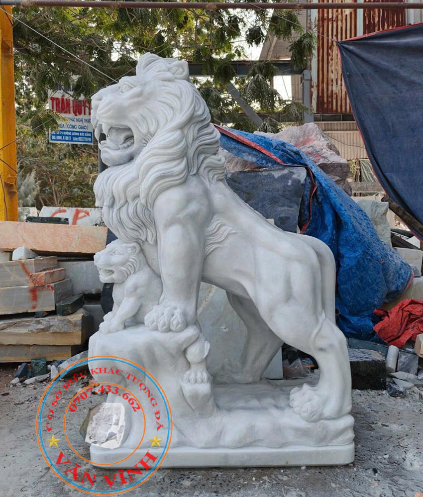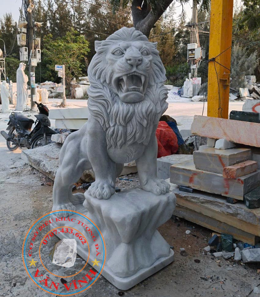 Cặp sư tử ngồi đá trắng xanh cao 1 mét được chế tác từ đá trắng xanh tự nhiên nguyên khối, dưới bàn tay điêu khắc của các nghệ nhân làng đá Non Nước – Xưởng Điêu Khắc Văn Vĩnh mang đến vẻ đẹp tinh tế, sang trọng và toát lên sự uy nghi, mạnh mẽ. Đặc điểm nổi bật: