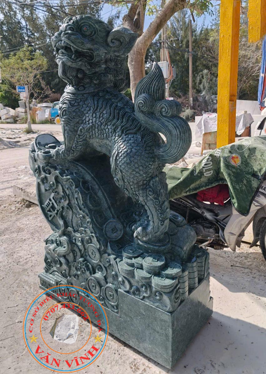 Tượng nghê bằng đá xanh Ấn Độ (cao 1,7 mét) là dòng sản phẩm cao cấp, được chế tác thủ công tinh xảo tại xưởng điêu khắc đá Văn Vĩnh. Đây là mẫu linh vật phong thủy vừa mang giá trị thẩm mỹ cao, vừa có ý nghĩa trấn trạch – bảo vệ gia chủ.