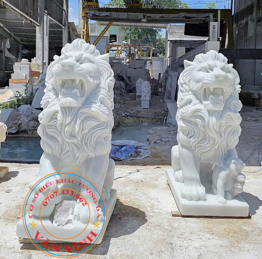 Cặp sư tử đá trắng cẩm thạch tự nhiên cao 1,5 mét là sản phẩm được chế tác từ đá cẩm thạch trắng nguyên khối từ xưởng điêu khắc tượng đá Văn Vĩnh – Tượng đá Non Nước, có độ bền cao và vẻ đẹp sang trọng. Sư tử là linh vật phong thủy mang nhiều ý nghĩa tốt đẹp, tượng trưng cho sức mạnh, sự uy quyền, dũng cảm và khả năng bảo vệ gia chủ khỏi tà khí. Đặc điểm: